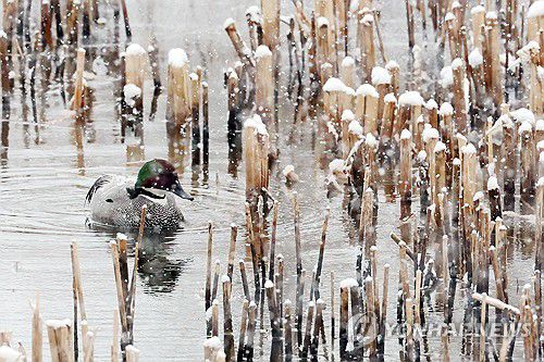 (세종=연합뉴스) 김주성 기자 = 충청 지역 곳곳에 대설주의보가 내려진 24일 세종시 세종호수공원에서 청둥오리 한 마리가 눈을 맞으며 먹이활동을 하고 있다. 대설주의보는 24시간 동안 눈이 5㎝ 이상 쌓일 것으로 예측될 때 내려진다. 2026.2.24 utzza@yna.co.kr ▶제보는 카카오톡 okjebo ▶연합뉴스 앱 지금 바로 다운받기~ ▶네이버 연