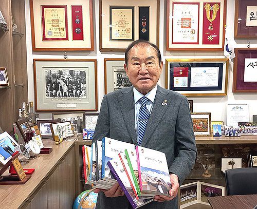 (서울=연합뉴스) 박현수 기자 = 라종억 통일문화연구원 이사장이 지난 24일 서울 강남구 통일문화연구원에서 박정희·노태우·김대중 대통령으로부터 받은 훈장을 배경으로 최근 발간한 9권의 현장 답사기 시리즈를 들어 보이고 있다. 2026.2.25 phyeonsoo@yna.co.kr ▶제보는 카카오톡 okjebo ▶연합뉴스 앱 지금 바로 다운받기~ ▶네이버 연합