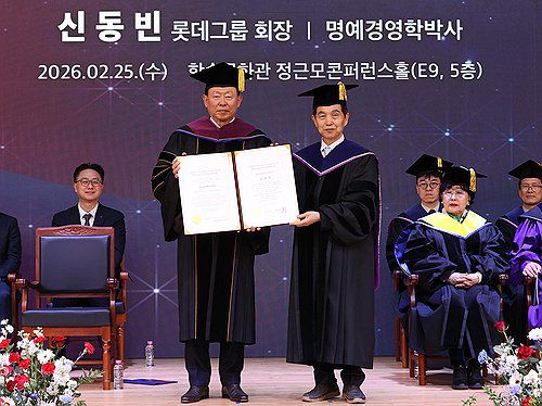 (서울=연합뉴스) 신동빈 롯데그룹 회장(왼쪽)이 지난 25일 대전 카이스트 본원에서 열린 학위 수여식에서 카이스트 명예 경영학 박사 학위를 받고 있다. 2026.2.26 [롯데그룹 제공. 재판매 및 DB 금지] photo@yna.co.kr ▶제보는 카카오톡 okjebo ▶연합뉴스 앱 지금 바로 다운받기~ ▶네이버 연합뉴스 채널 구독하기 <저작권자(c) 연합