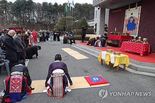 (의정부=연합뉴스) 임병식 기자 = 26일 오후 경기 의정부시청에서 열린 조선 태조 이성계 어진 고유제에서 김동근 의정부시장이 어진을 향해 절하고 있다. 이번에 제작된 어진은 가로 1.5m, 세로 2.2m 크기의 모사본으로 권오창 화백이 제작했다. 2026.2.26 andphotodo@yna.co.kr ▶제보는 카카오톡 okjebo ▶연합뉴스 앱 지금 바로