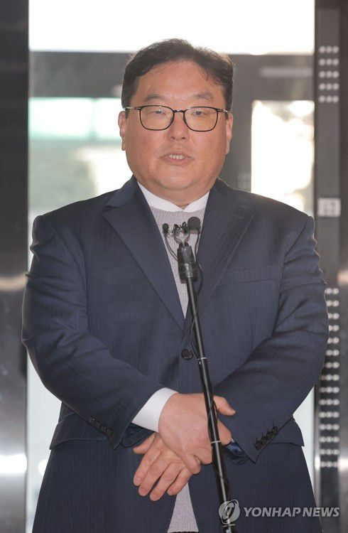 (서울=연합뉴스) 류영석 기자 = 쿠팡 퇴직금 미지급 사건과 관련해 직권남용 권리행사 방해 및 국회에서의 증언·감정 등에 관한 법률 위반 혐의로 기소된 엄희준 검사가 27일 서울 서초구 안권섭 쿠팡·관봉권 상설특별검사팀 사무실 앞에서 기소 반박 기자회견을 하고 있다. 2026.2.27 ondol@yna.co.kr ▶제보는 카카오톡 okjebo ▶연합뉴스 앱