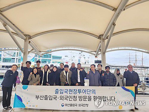 (부산=연합뉴스) 부산출입국외국인청은 27일 부산항 등에서 외국인 유학생, 교수, 직장인 등 시민 14명을 초청해 출입국외국인청의 업무를 체험하는 현장 투어를 실시했다고 밝혔다. 사진은 체험을 마치고 기념 촬영하는 모습. 2026.2.27 [부산출입국외국인청 제공. 재판매 및 DB 금지] psj19@yna.co.kr ▶제보는 카카오톡 okjebo ▶연합뉴스
