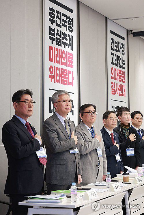 (서울=연합뉴스) 한종찬 기자 = 김택우 대한의사협회장(왼쪽 두번째)과 김교웅 대한의사협회 대의원회 의장(왼쪽 첫번째)을 비롯한 참석자들이 28일 서울 용산구 대한의사협회 회관에서 열린 임시대의원총회에서 국민의례를 하고 있다. 이날 대한의사협회는 의대 정원 증원에 대응하기 위한 비대위 구성 등을 추진한다. 2026.2.28 saba@yna.co.kr ▶제보