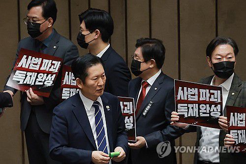 (서울=연합뉴스) 신현우 기자 = 더불어민주당 정청래 대표가 28일 국회에서 열린 2월 임시국회 8차 본회의에서 전날 상정된 법원조직법 개정안(대법관 증원법)에 대한 무제한 토론 종결 동의의 건 투표를 하고 있다. 정 대표 주위에서 국민의힘 송언석 원내대표 등 의원들이 사법개혁 3법(법왜곡죄·재판소원제·대법관 증원) 규탄 시위를 하고 있다. 2026.2.2