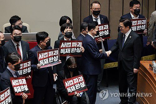 (서울=연합뉴스) 신현우 기자 = 우원식 국회의장이 28일 국회에서 열린 2월 임시국회 8차 본회의에서 전날 상정된 법원조직법 개정안(대법관 증원법)에 대한 무제한 토론 종결 동의의 건 투표를 하며 사법개혁 3법(법왜곡죄·재판소원제·대법관 증원) 규탄 시위를 하는 국민의힘 의원들과 인사하고 있다. 2026.2.28 nowwego@yna.co.kr ▶제보는