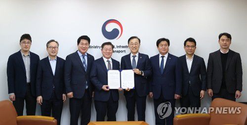 (광명=연합뉴스) 수도권 서남부 지역 4개 지자체가 3일 '신천~하안~신림선'의 국가철도망 구축계획 반영과 조속한 사업 추진을 국토교통부에 공동 건의했다. (왼쪽 두번째부터) 유성훈 금천구청장, 박준희 관악구청장, 박승원 광명시장, 김윤덕 국토교통부 장관, 임병택 시흥시장이 서울 정동 국토발전전시관 내 장관 집무실에서 기념 촬영을 하는 모습.2026.3.3