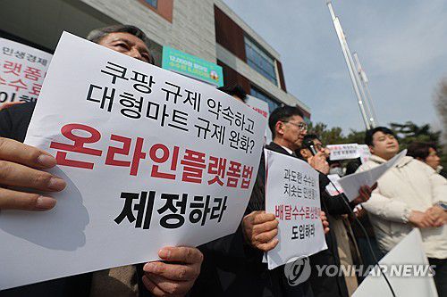 (서울=연합뉴스) 서대연 기자 = 참여연대 등 단체 회원들이 5일 서울 종로구 정부서울청사 창성동 별관 앞에서 열린 대형마트 규제 완화 논의 중단 및 독점 플랫폼 기업 갑질 규제 촉구 기자회견에서 손팻말을 들고있다. 2026.3.5 dwise@yna.co.kr ▶제보는 카카오톡 okjebo ▶연합뉴스 앱 지금 바로 다운받기~ ▶네이버 연합뉴스 채널 구독하기
