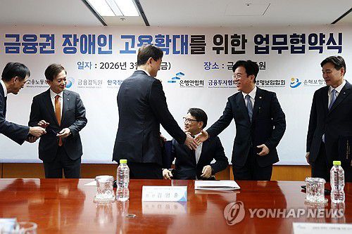 (서울=연합뉴스) 윤동진 기자 = 김영훈 고용노동부 장관(오른쪽 두 번째)과 이찬진 금융감독원장(왼쪽 세 번째)이 6일 금융감독원에서 열린 을 마친 후 악수를 하고 있다. 2026.3.6 mon@yna.co.kr ▶제보는 카카오톡 okjebo ▶연합뉴스 앱 지금 바로 다운받기~ ▶네이버 연합뉴스 채널 구독하기 <저작권자(c) 연합뉴스, 무단 전재-재배포,