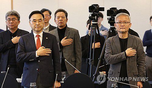 (서울=연합뉴스) 김주형 기자 = 차정인 국가교육위원장(앞줄 왼쪽)과 기조 발제자인 박태웅 녹서포럼 의장이 6일 서울 중구 한국프레스센터에서 열린 '인공지능(AI) 전환 시대 국가교육 비전 포럼'에 참석해 국기에 경례하고 있다. 2026.3.6 kjhpress@yna.co.kr ▶제보는 카카오톡 okjebo ▶연합뉴스 앱 지금 바로 다운받기~ ▶네이버 연합
