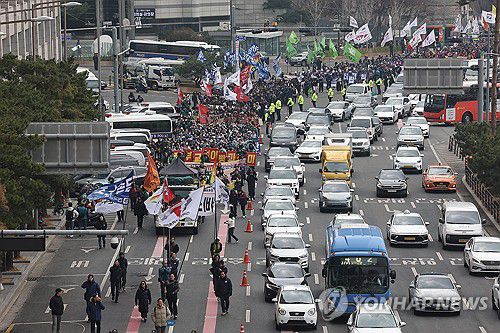 (서울=연합뉴스) 김성민 기자 = 전국민주노동조합총연맹(민주노총) 조합원들이 6일 서울 용산구 KDB생명타워 인근에서 3·8 세계 여성의 날 전국노동자대회가 열리는 광화문 동십자각 방면으로 행진하고 있다. 2026.3.6 ksm7976@yna.co.kr ▶제보는 카카오톡 okjebo ▶연합뉴스 앱 지금 바로 다운받기~ ▶네이버 연합뉴스 채널 구독하기 <저작