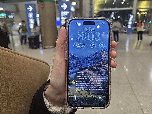 (영종도=연합뉴스) 박수현 기자 = 6일 두바이에서 에미레이트 항공 EK322편을 타고 인천에 도착한 박채영(27)씨가 두바이에 있을 때 받은 긴급재난문자를 보여주고 있다. 2026.3.6 photo@yna.co.kr ▶제보는 카카오톡 okjebo ▶연합뉴스 앱 지금 바로 다운받기~ ▶네이버 연합뉴스 채널 구독하기 <저작권자(c) 연합뉴스, 무단 전재-재배