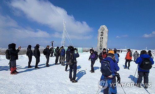 눈 쌓인 백두대간 오르는 등산객들