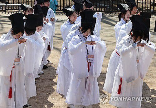 (서울=연합뉴스) 서명곤 기자 = 8일 서울 종로구 성균관대학교 명륜당에서 열린 신입생 환영회 신방례에서 신입생들이 예를 갖추고 있다. 신방례는 조선 시대 과거에 합격한 유생들을 환영하기 위해 열리던 전통 의식이다. 2026.3.8 seephoto@yna.co.kr ▶제보는 카카오톡 okjebo ▶연합뉴스 앱 지금 바로 다운받기~ ▶네이버 연합뉴스 채널 구