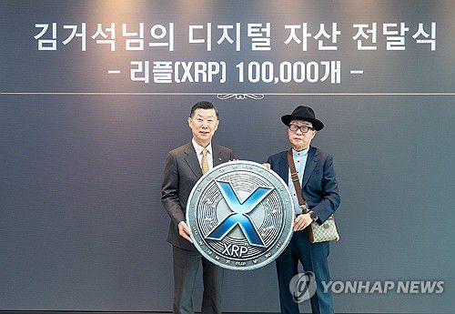 (서울=연합뉴스) 대한적십자사는 김거석 후원자가 취약계층 지원을 위한 가상자산 '엑스알피(XRP)' 100,000개를 기부했다고 9일 밝혔다. 김홍국 대한적십자사 회장 직무대행(왼쪽)과 김거석 후원자가 기념 촬영하고 있다. 2026.3.9 [대한적십자사 제공. 재판매 및 DB 금지] photo@yna.co.kr ▶제보는 카카오톡 okjebo ▶연합뉴스 앱