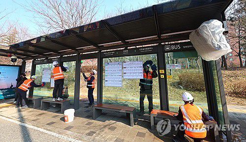 (인천=연합뉴스) 임순석 기자 = 12일 인천 연수구 송도 연세대학교 국제캠퍼스 앞 버스 정류장에서 인천교통공사 승강대 관리팀 직원들이 봄맞이 청소를 하고 있다. 인천교통공사는 관내 버스 정류장 3,657개소, 택시 승차대 91개소에서 겨우내 미세먼지와 찌든 때를 제거하는 봄맞이 청소를 실시하고 있다. 2026.3.12 soonseok02@yna.co.kr