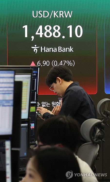(서울=연합뉴스) 김주형 기자 = 13일 오전 서울 중구 하나은행 딜링룸에 원/달러 환율이 표시되고 있다. 원/달러 환율은 13일 국제 유가 급등에 이틀 연속 상승하며 9.4원 오른 1,490.6원대로 출발했다. 2026.3.13 kjhpress@yna.co.kr ▶제보는 카카오톡 okjebo ▶연합뉴스 앱 지금 바로 다운받기~ ▶네이버 연합뉴스 채널 구독