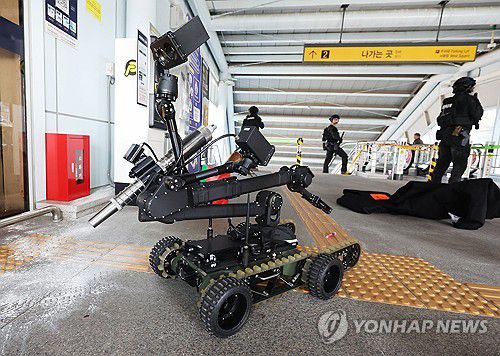 (평택=연합뉴스) 홍기원 기자 = 16일 경기도 평택시 지제동 평택지제역에서 열린 '테러 대비 민ㆍ관ㆍ군ㆍ경ㆍ소방 통합방호훈련'에서 로봇이 폭발물을 처리하고 있다. 이번 훈련에는 평택시, 경찰, 육군 제51보병사단, 경기남부경찰청 경찰특공대 등이 참여했다. 2026.3.16 xanadu@yna.co.kr ▶제보는 카카오톡 okjebo ▶연합뉴스 앱 지금 바