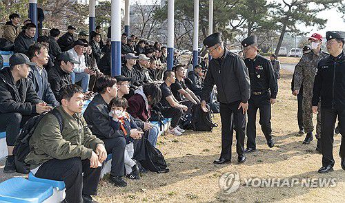 (창원=연합뉴스) 16일 경남 창원시 진해구 해군교육사령부에서 열린 '부사관 후보생 291기' 입영식에서 강정호(중장) 교육사령관과 백준철(준장) 기초군사교육단장 등 지휘관 참모들이 가족들과 인사를 나누고 있다. 부사관 후보생 291기 492명은 9주간 군인화·해군화·간부화 교육 훈련을 통해 정예 해군 부사관으로 성장한다. 2026.3.16 [해군 제공.