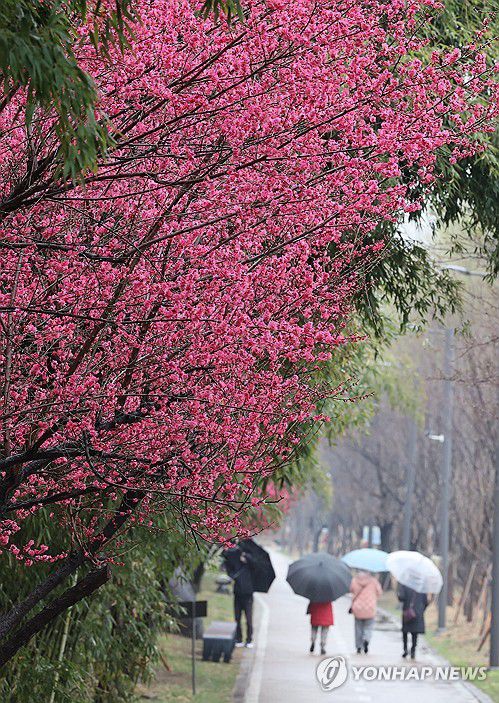 (서울=연합뉴스) 서명곤 기자 = 비가 내린 18일 서울 성동구 하동매실거리에 홍매화가 활짝 피어있다.2026.3.18 seephoto@yna.co.kr ▶제보는 카카오톡 okjebo ▶연합뉴스 앱 지금 바로 다운받기~ ▶네이버 연합뉴스 채널 구독하기 <저작권자(c) 연합뉴스, 무단 전재-재배포, AI 학습 및 활용 금지> <저작권자(c)연합뉴스. 무단전재