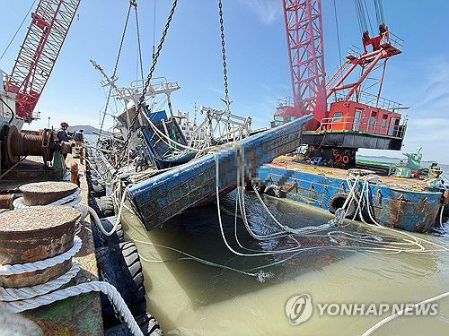 (보령=연합뉴스) 19일 낮 12시 40분께 충남 보령시 오천면 소화사도 인근 해상에서 크레인선이 지난 6일 침몰한 어선 A호를 13일 만에 인양하고 있다. 2026.3.19 [보령해경 제공. 재판매 및 DB 금지] soyun@yna.co.kr ▶제보는 카카오톡 okjebo ▶연합뉴스 앱 지금 바로 다운받기~ ▶네이버 연합뉴스 채널 구독하기 <저작권자(c)