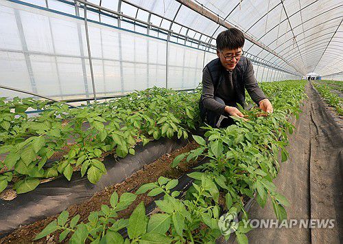 (강릉=연합뉴스) 유형재 기자 = 강원 강릉에서 2중 비닐하우스를 활용해 난방하지 않는 겨울감자 시설 재배로 노지 재배 대비 3∼4배 높은 소득을 올리고 있어 눈길을 끌고 있다. 25일 강릉시 송정동 한 농민이 일반 봄감자보다 2개월가량 이른 5월 초·중순부터 수확하는 겨울감자 재배 상태를 살펴보고 있다. 2026.3.25 yoo21@yna.co.kr ▶제