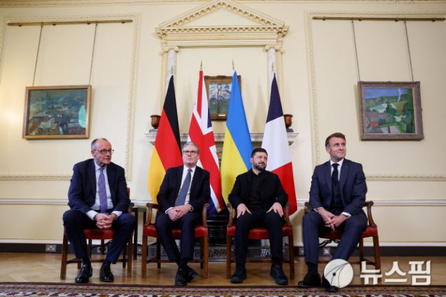 [런던 로이터=뉴스핌] 장일현 특파원 = 프리드리히 메르츠 독일 총리와 키어 스타머 영국 총리, 볼로디미르 젤렌스키 우크라이나 대통령, 에마뉘엘 마크롱 프랑스 대통령(왼쪽부터)이 8일(현지 시간) 영국 런던 다우닝가 10번지 영국 총리실에 모였다. 2025.12.08. ihjang67@newspim.com 저작권자(c) 글로벌리더의 지름길 종합뉴스통신사 뉴