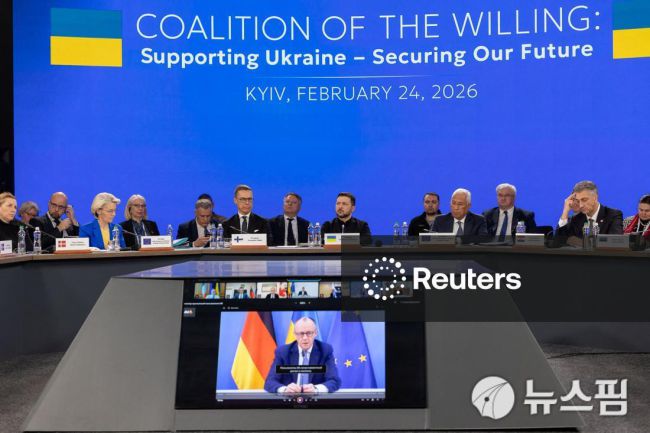 [런던=뉴스핌] 장일현 특파원 = 우크라이나 전쟁이 발발한 지 만 4년이 되는 24일(현지 시간) 우크라이나 수도 키이우를 방문한 유럽연합(EU)의 정상들과 볼로디미르 젤렌스키 우크라이나 대통령이 화상으로 열린 '의지의 연합' 정상회의에 참석하고 있다. 화면에는 독일의 프리드리히 메르츠 총리가 보이고 있다. 2026.02.24. ihjang67@newspi