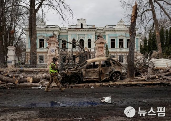 [수미 로이터=뉴스핌] 장일현 특파원 = 13일(현지시간) 러시아의 미사일 공격으로 우크라이나 북동부 수미 지역에서 최소 34명이 사망하고 117명이 부상을 당했다. 사진은 이날 피격으로 피해를 입은 현장 앞을 한 우크라이나 군인이 걷고 있는 모습. ihjang67@newspim.com 저작권자(c) 글로벌리더의 지름길 종합뉴스통신사 뉴스핌(Newspim)