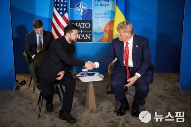 [헤이그=로이터 뉴스핌]김근철 기자=도널드 트럼프 미국 대통령(오른 쪽)과 볼로도미르 젤렌스키 우크라이나 대통령이 25일(현지시간) 북대서양조약기구(나토) 정상회담이 열리는 네덜란드 헤이그에서 정상회담을 하면서 악수하고 있다. 2025.06.26 kckim100@newspim.com kckim100@newspim.com 저작권자(c) 글로벌리더의 지름길 종