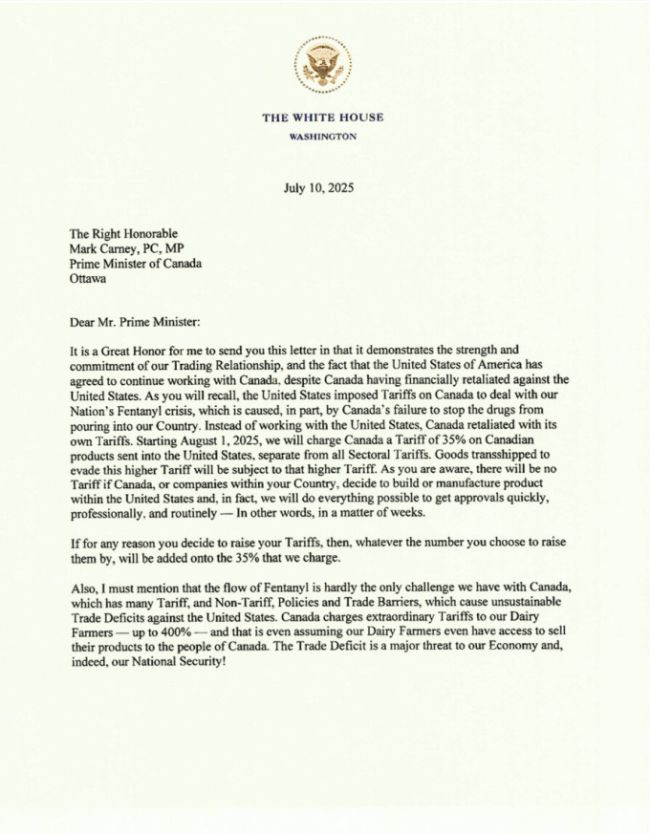 도널드 트럼프 미국 대통령이 10일(현지시간) 캐나다에 보낸 상호 관세율 통보 공개 서한(1/2쪽). 오는 8월 1일부터 캐나다에 적용될 상호 관세율은 35%다. [사진=트루스소셜] 저작권자(c) 글로벌리더의 지름길 종합뉴스통신사 뉴스핌(Newspim), 무단 전재-재배포 금지
