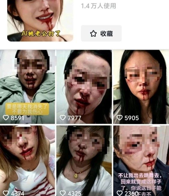 [서울신문 나우뉴스] 가짜 폭력 피해 영상을 콘텐츠로 중국 SNS에서 피 흘리고 멍든 얼굴을 만들어주는 AI 효과를 이용한 자극적인 콘텐츠가 인기를 끌고 있다. 지우파이신문 인공지능(AI) 기술이 만들어낸 ‘멍든 얼굴’이 중국 소셜미디어(SNS)에서 유행처럼 번지고 있다. 얼굴에 타박상과 상처를 합성한 가정폭력 피해자 연출 영상이 중국 숏폼 영상 플랫폼을