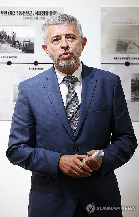 (서울=연합뉴스) 신준희 기자 = 3일 성수동 갤러리 까르찌나에서 열린 종전 80주년 특별전에서 게오르기 지노비예프 주한 러시아대사가 인사말을 하고 있다. 전시를 주최한 주한러시아대사관은 "제2차 세계대전 당시 일본의 항복 결정에 원자폭탄 투하 등 서방의 군사행동이 결정적이었다고 알려져 있으나, 소련군의 참전 또한 일본 항복과 전쟁 종결에 중대한 기여를 했