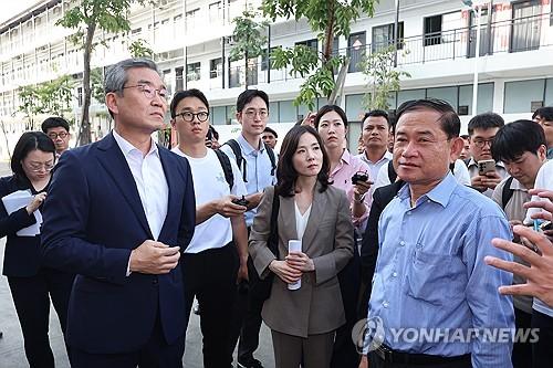 (프놈펜=연합뉴스) 서대연 기자 = 김진아 외교부2차관, 박성주 경찰청 국가수사본부장을 비롯한 정부 합동대응팀 구성원들이 16일(현지시간) 캄보디아 프놈펜 인근 범죄단지인 태자단지에서 팡 나렌 온라인스캠대응위 사무차장(오른쪽 첫번째 파란 셔츠)의 설명을 듣고 있다. 2025.10.16 dwise@yna.co.kr ▶제보는 카카오톡 okjebo ▶연합뉴스 앱
