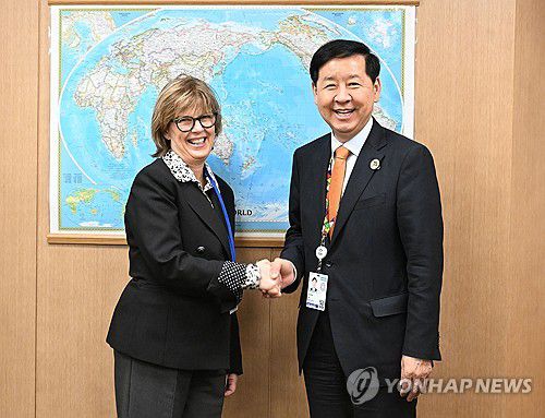 (서울=연합뉴스) 주요 20개국(G20) 재무장관회의와 국제통화기금 및 세계은행(IMF/WB) 연차총회 참석차 미국 워싱턴DC를 방문 중인 구윤철 부총리 겸 기획재정부 장관이 16일(현지시간) 국제통화기금(IMF)에서 발레리 위흐뱅 유로클리어 그룹 대표와 악수하고 있다. 2025.10.17 [기획재정부 제공. 재판매 및 DB 금지] photo@yna.co.