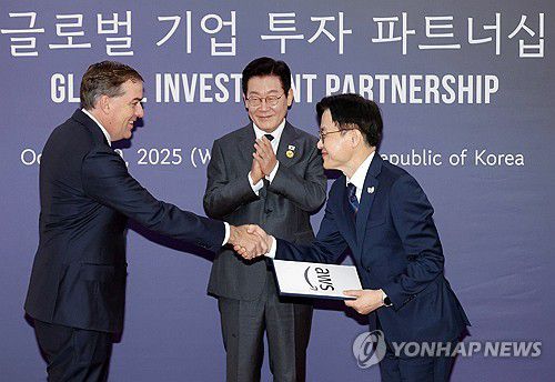 (경주=연합뉴스) 한상균 기자 = 이재명 대통령이 29일 경북 경주예술의전당에서 열린 아마존웹서비스(AWS) 투자협약식에서 맷 가먼 CEO가 김정관 산업부 장관에게 투자신고서를 전달하는 모습을 보며 박수치고 있다. 2025.10.29 xyz@yna.co.kr ▶제보는 카카오톡 okjebo ▶연합뉴스 앱 지금 바로 다운받기~ ▶네이버 연합뉴스 채널 구독하기