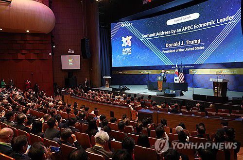 (경주=연합뉴스) 도널드 트럼프 미국 대통령이 29일 경주예술의전당에서 열린 2025 아시아태평양경제협력체(APEC) 정상회의 최고경영자(CEO) 서밋에 참석해 연설하고 있다.2025.10.29 [대한상공회의소 제공. 재판매 및 DB 금지] photo@yna.co.kr ▶제보는 카카오톡 okjebo ▶연합뉴스 앱 지금 바로 다운받기~ ▶네이버 연합뉴스 채널