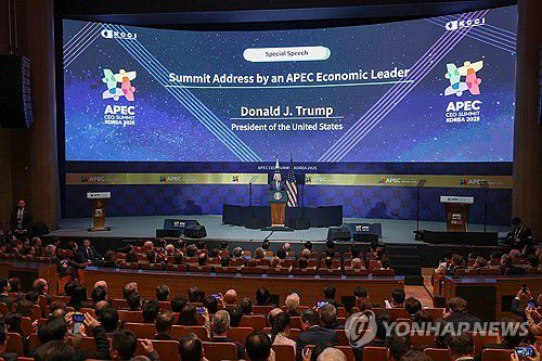 (경주=연합뉴스) 한종찬 기자 = 도널드 트럼프 미국 대통령이 29일 경북 경주 예술의전당에서 열린 '2025 아시아태평양경제협력체 최고경영자 서밋(APEC CEO SUMMIT)'에 참석해 연설하고 있다. 2025.10.29 [공동취재] saba@yna.co.kr ▶제보는 카카오톡 okjebo ▶연합뉴스 앱 지금 바로 다운받기~ ▶네이버 연합뉴스 채널 구독