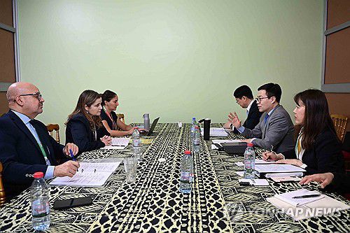 (서울=연합뉴스) 여한구 산업통상부 통상교섭본부장이 24일(현지시간) 카메룬 야운데에서 제14차 각료회의 참석, 파트리시아 프루토스 루이스 파라과이 외교부 경제관계 및 통합 차관과 면담하고 있다. 2026.3.25 [산업통상부 제공. 재판매 및 DB 금지] photo@yna.co.kr ▶제보는 카카오톡 okjebo ▶연합뉴스 앱 지금 바로 다운받기~ ▶네이