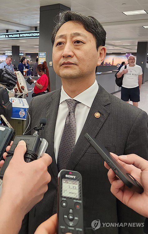 (워싱턴=연합뉴스) 강병철 특파원 = 안덕근 산업통상자원부 장관이 미국과의 이른바 2+2 통상 협의를 하루 앞둔 23일(현지시간) 워싱턴DC 인근 덜레스 공항을 통해 미국으로 입국하며 취재진의 질문을 받고 있다. 2025.4.24 soleco@yna.co.kr ▶제보는 카카오톡 okjebo ▶연합뉴스 앱 지금 바로 다운받기~ ▶네이버 연합뉴스 채널 구독하기