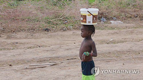 카메룬 미나와오 난민캠프에서 물통을 이고 집으로 향하는 아이