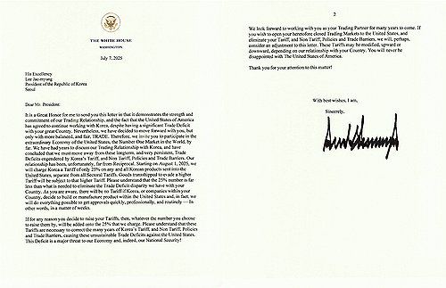 (워싱턴=연합뉴스) 도널드 트럼프 미국 대통령이 7일(현지시간) 이재명 대통령에게 보낸 서한으로 오는 8월 1일부터 한국에 25% 상호관세를 부과하겠다는 내용이 담겨 있다. 2025.7.8 [트럼프 대통령 트루스소셜 계정 캡처. 재판매 및 DB 금지] photo@yna.co.kr ▶제보는 카카오톡 okjebo ▶연합뉴스 앱 지금 바로 다운받기~ ▶네이버 연
