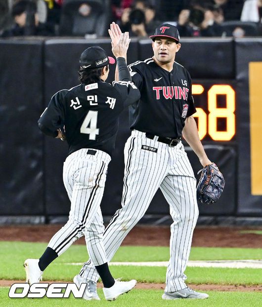 30일 대전 한화생명볼파크에서 2025 신한 SOL Bank KBO리그 포스트시즌 한국시리즈 4차전 한화 이글스와 LG 트윈스의 경기가 열렸다. 이날 경기에 한화는 와이스를, LG는 치리노스를 선발투수로 내세웠다. 5회말 2사 2루 문현빈의 타구를 호수비 펼친 신민재가 치리노스와 하이파이브를 하고 있다. 2025.10.30 / soul1014@osen.co