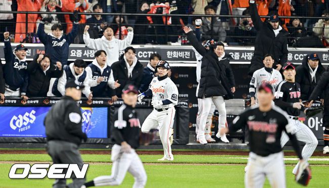 30일 대전 한화생명볼파크에서 2025 신한 SOL Bank KBO리그 포스트시즌 한국시리즈 4차전 한화 이글스와 LG 트윈스의 경기가 열렸다. 이날 경기에 한화는 와이스를, LG는 치리노스를 선발투수로 내세웠다. 7회말 2사 2,3루 한화 문현빈이 2타점 적시타를 날리고 질주하고 있다. 2025.10.30 / soul1014@osen.co.kr