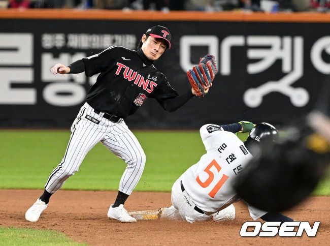 30일 대전 한화생명볼파크에서 2025 신한 SOL Bank KBO리그 포스트시즌 한국시리즈 4차전 한화 이글스와 LG 트윈스의 경기가 열렸다. 이날 경기에 한화는 와이스를, LG는 치리노스를 선발투수로 내세웠다. 7회말 2사 1루에서 한화 1루주자 문현빈이 도루에 성공하고 있다. 2025.10.30 /sunday@osen.co.kr