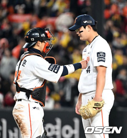 30일 대전 한화생명볼파크에서 2025 신한 SOL Bank KBO리그 포스트시즌 한국시리즈 4차전 한화 이글스와 LG 트윈스의 경기가 열렸다. 이날 경기에 한화는 와이스를, LG는 치리노스를 선발투수로 내세웠다. 9회초 무사 1루에서 마운드를 방문한 한화 최재훈이 김서현과 이야기를 나누고 있다. 2025.10.30 /sunday@osen.co.kr
