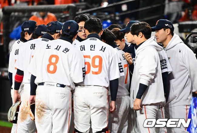 31일 대전 한화생명볼파크에서 2025 신한 SOL Bank KBO리그 포스트시즌 한국시리즈 5차전 한화 이글스와 LG 트윈스의 경기가 열렸다. 이날 경기에 한화는 문동주를, LG는 톨허스트를 선발투수로 내세웠다. 6회말을 앞두고 한화 선수들이 미팅을 하고 있다. 2025.10.31 /jpnews@osen.co.kr