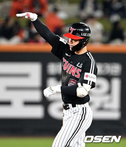 31일 대전 한화생명볼파크에서 2025 신한 SOL Bank KBO리그 포스트시즌 한국시리즈 5차전 한화 이글스와 LG 트윈스의 경기가 열렸다. 이날 경기에 한화는 문동주를, LG는 톨허스트를 선발투수로 내세웠다. 7회초 1사에서 LG 구본혁이 우전 2루타를 치고 환호하고 있다. 2025.10.31 /sunday@osen.co.kr