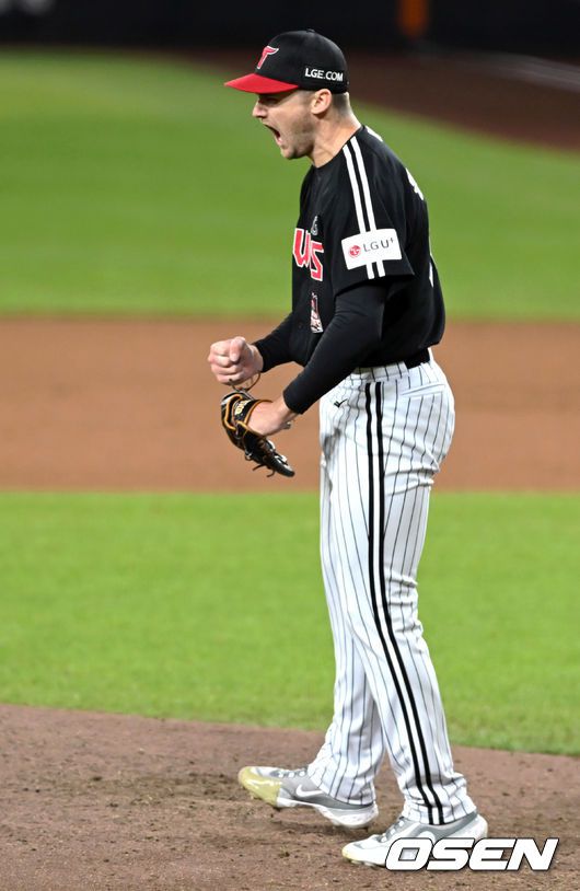 31일 대전 한화생명볼파크에서 2025 신한 SOL Bank KBO리그 포스트시즌 한국시리즈 5차전 한화 이글스와 LG 트윈스의 경기가 열렸다. 이날 경기에 한화는 문동주를, LG는 톨허스트를 선발투수로 내세웠다. 7회말 2사 톨허스트가 최재훈을 삼진으로 잡고 환호하고 있다. 2025.10.31/spjj@osen.co.kr