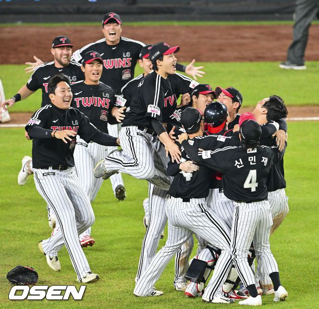 31일 대전 한화생명볼파크에서 2025 신한 SOL Bank KBO리그 포스트시즌 한국시리즈 5차전 한화 이글스와 LG 트윈스의 경기가 열렸다. 이날 경기에 한화는 문동주를, LG는 톨허스트를 선발투수로 내세웠다. 우승 확정 후 LG 선수들이 기뻐하고 있다. 2025.10.31 / soul1014@osen.co.kr