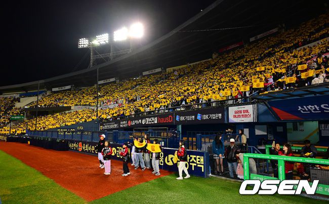 1일 오후 서울 잠실야구장에서 LG 트윈스의 '한국시리즈 통합우승 IN 잠실'행사가 열렸다. 팬들을 위한 트로피 퍼포먼스, 선수단 그라운드 행진, 비하인드 스몰토크, 선수단 샴페인 샤워 등 다양한 프로그램이 펼쳐진다. LG 만원 관중들이 수건을 펼치며 응원가를 부르고 있다. 2025.11.01 /rumi@osen.co.kr